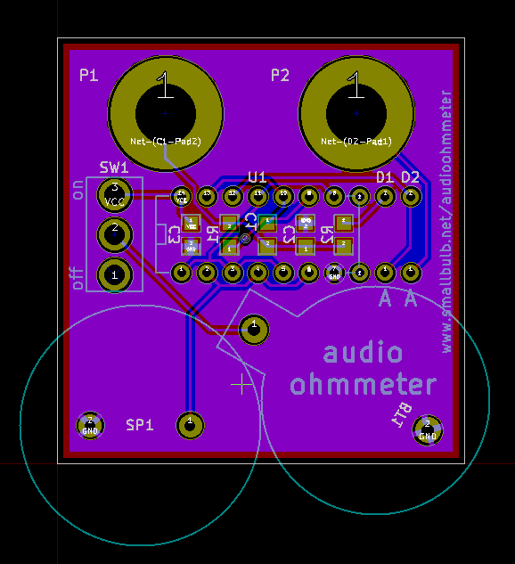 This acoustic/audio ohmmeter is a compact (< 5×5 cm PCB) and low power (< 1 mA on open circuit, ~4 mA on short circuit). Silicon parts (U1, D1, D2) are placed in a DIP20 socket for a case when you “measure” a charged high voltage capacitor which will blow the parts up.